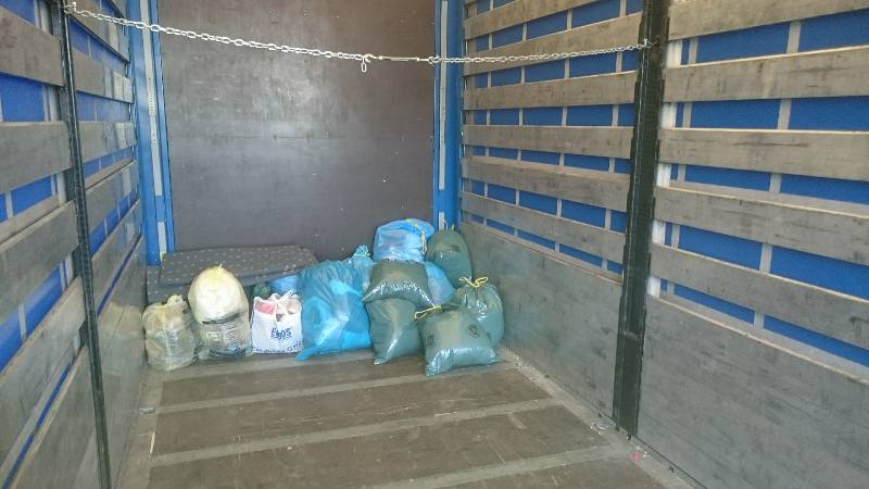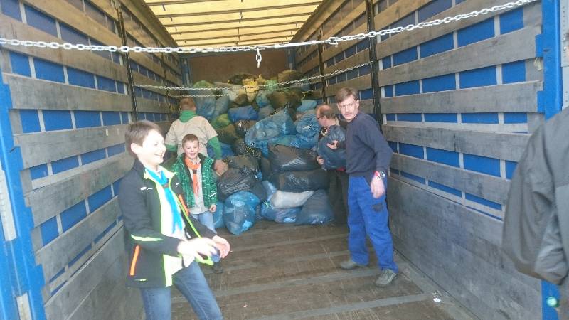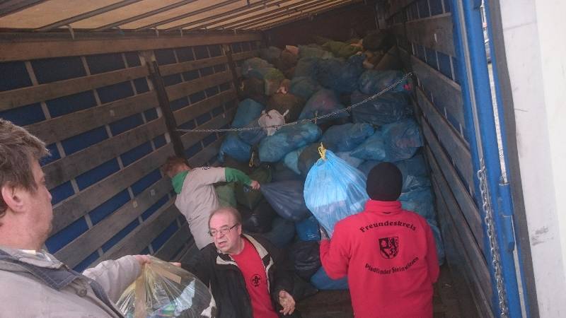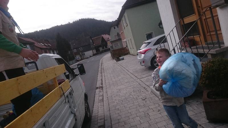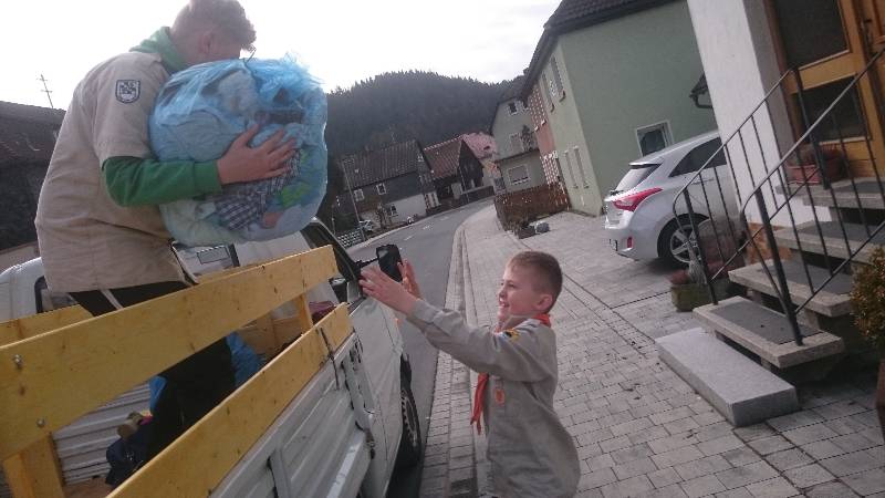 So machten wir uns auf den Weg durch die Straßen Steinwiesens. Viele Kleidersäcke standen am Rande der vielen Straßen für uns bereit. Einen nach dem anderen luden wir auf. Nachdem das Fahrzeug voll war, ging es zum Entladen an den LKW-Anhänger. Der Freundeskreis und die Pfadfinder arbeiteten Hand in Hand und so wurden in extrem kurzer Zeit viele Kleidersäcke verladen. Der Vorsitzende des Freundeskreises der Pfadfinder Steinwiesen e.V. – Arno Kuhnlein – hatte die wohl wichtigste Aufgabe diese Tages: Er holte den Leberkäse und die Semmeln.