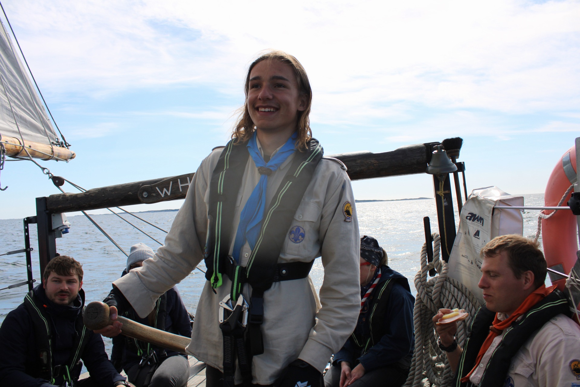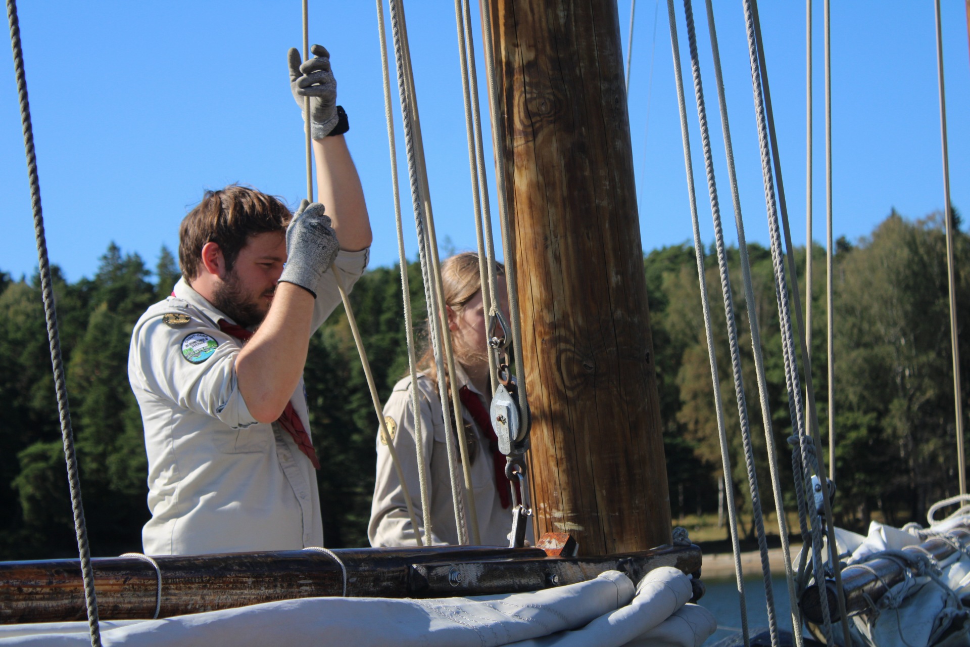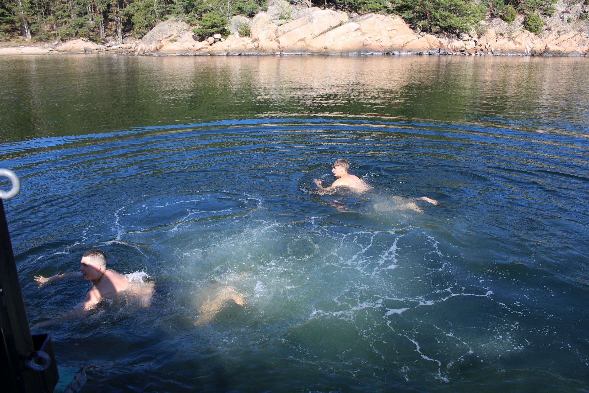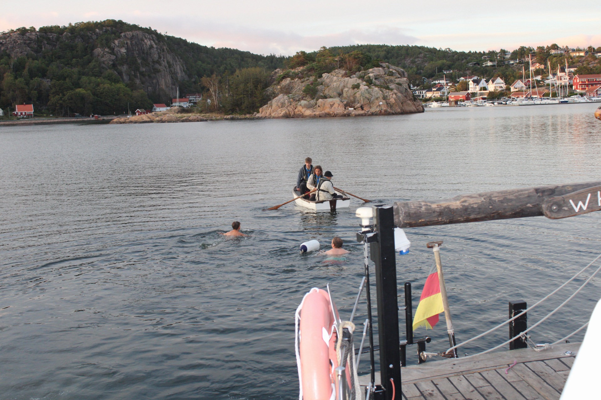 Am Tag darauf war das Wetter wieder wunderschön, jedoch der Wind etwas schwach. Es hieß „Alemann an Deck“ warum war die Frage ? Steff erklärte uns das wir soeben in Norwegische Gewässer gefahren sind und Schweden verlassen haben. Zum Flagge hissen gab es die Norwegische Nationalhymne. So kamen wir schon am Nachmittag in einer Bucht an. Badehosen an war der Befehl natürlich nur wer mochte. Eine geniale Möglichkeit das „Bergedreieck“ mal aus zu probieren. mit dieser Vorrichtung fanden über Bord gegangene Personen (in unserem Fall Pfadfinder) wieder zurück an Bord. Im Ernstfall käme das natürlich auch zum Einsatz.