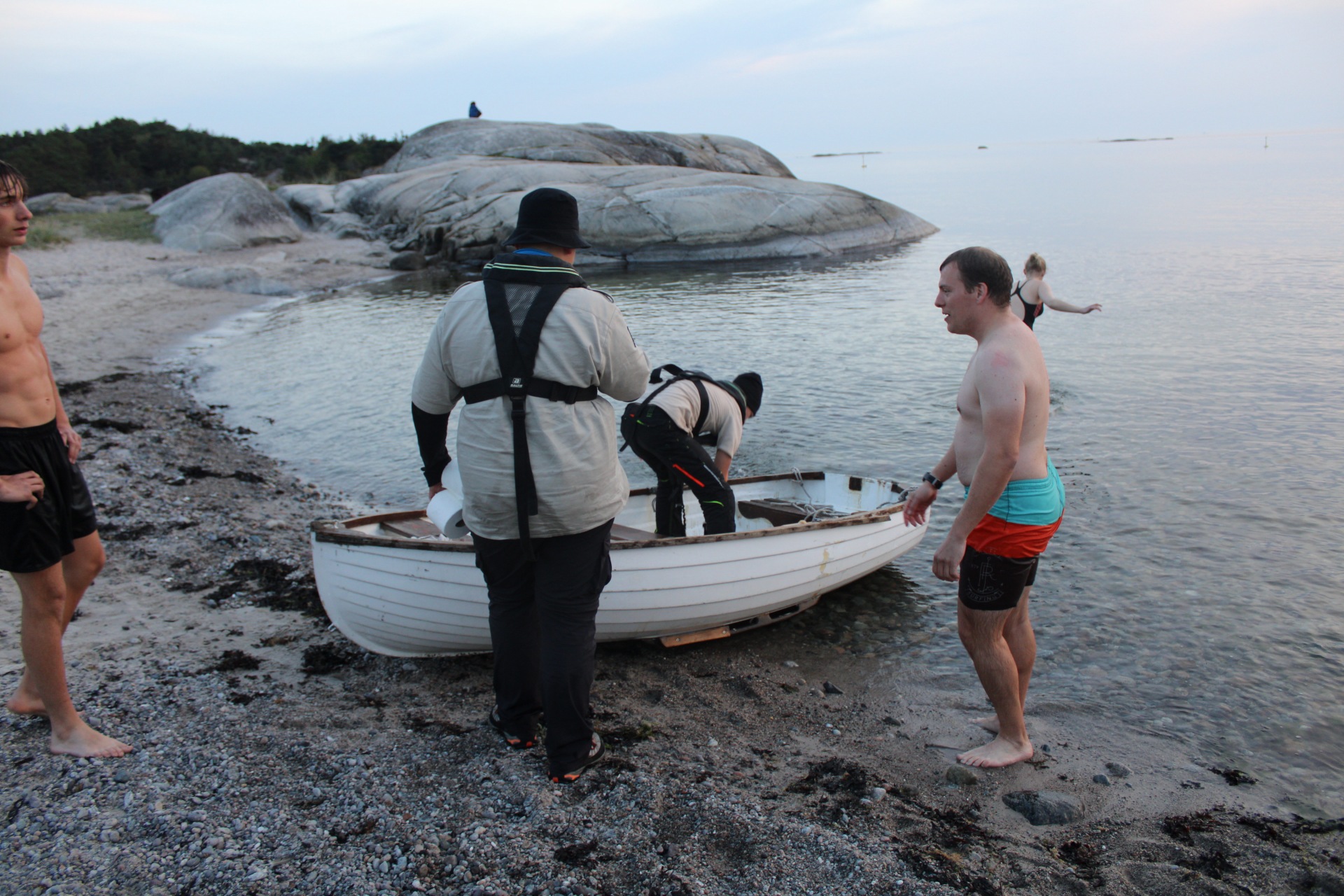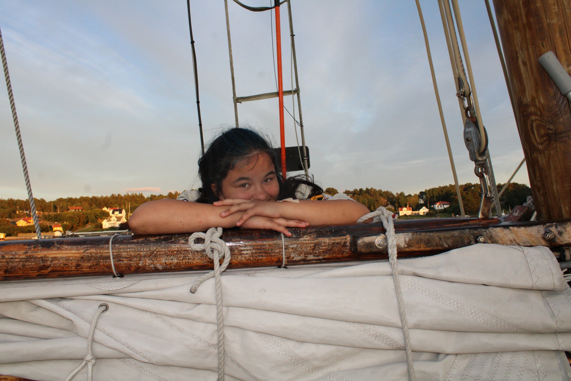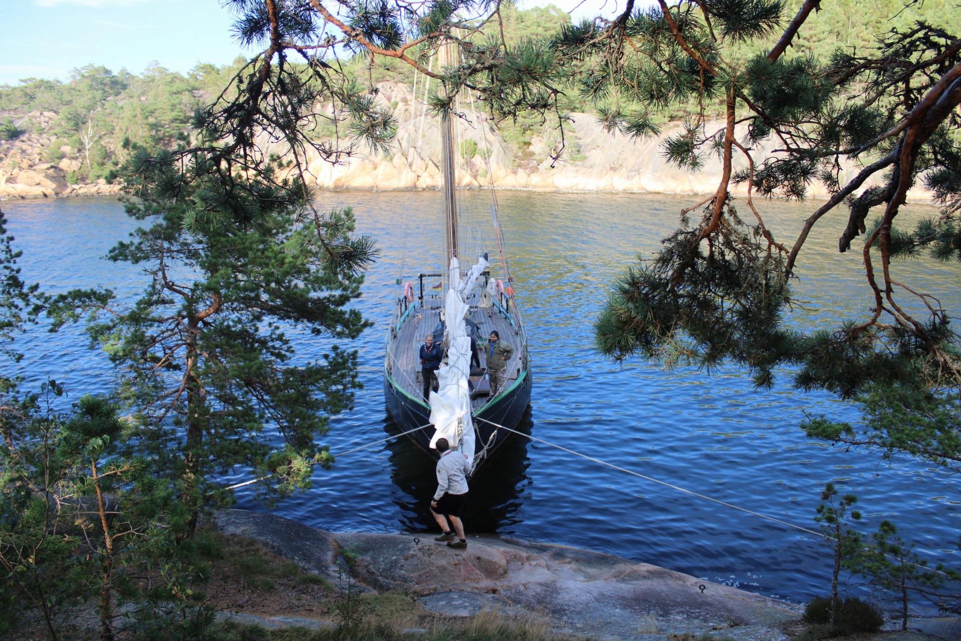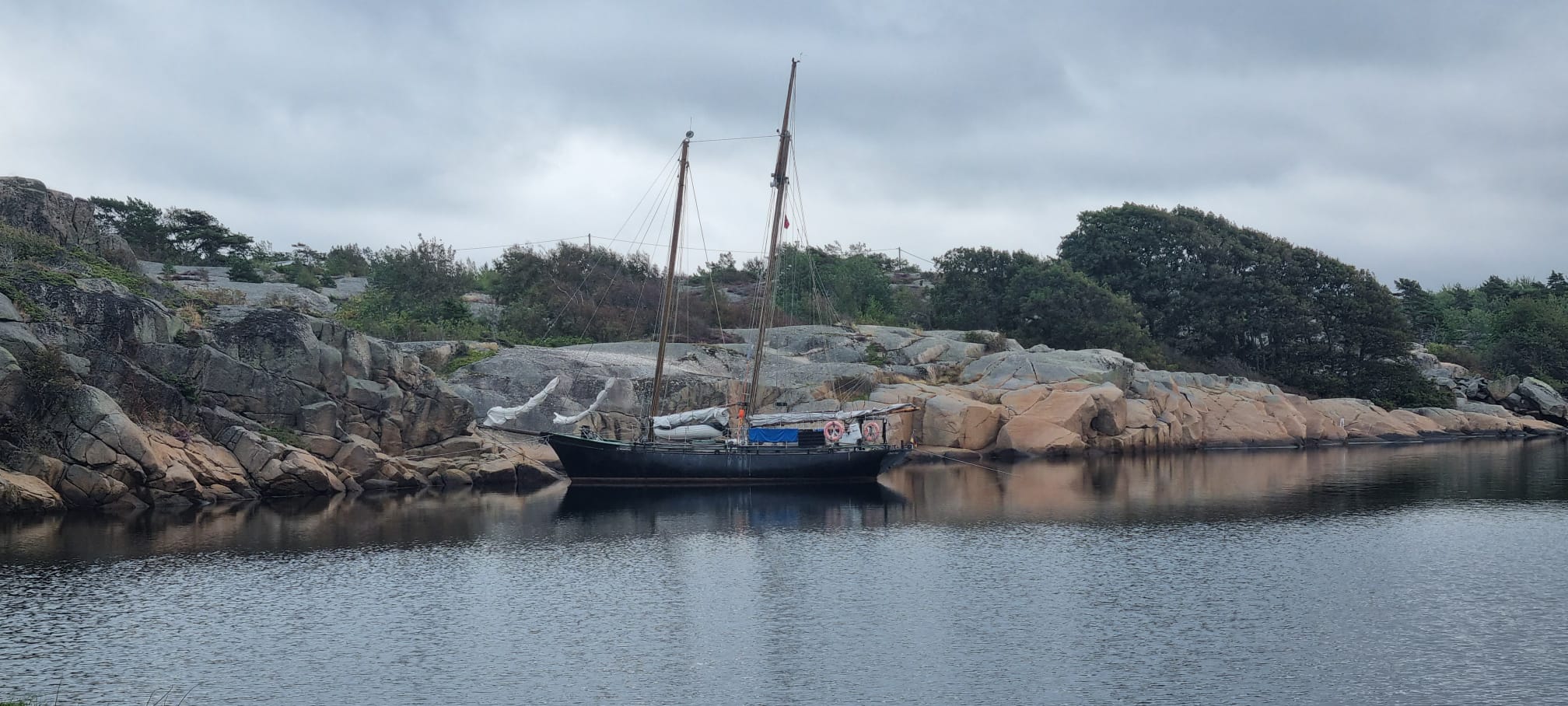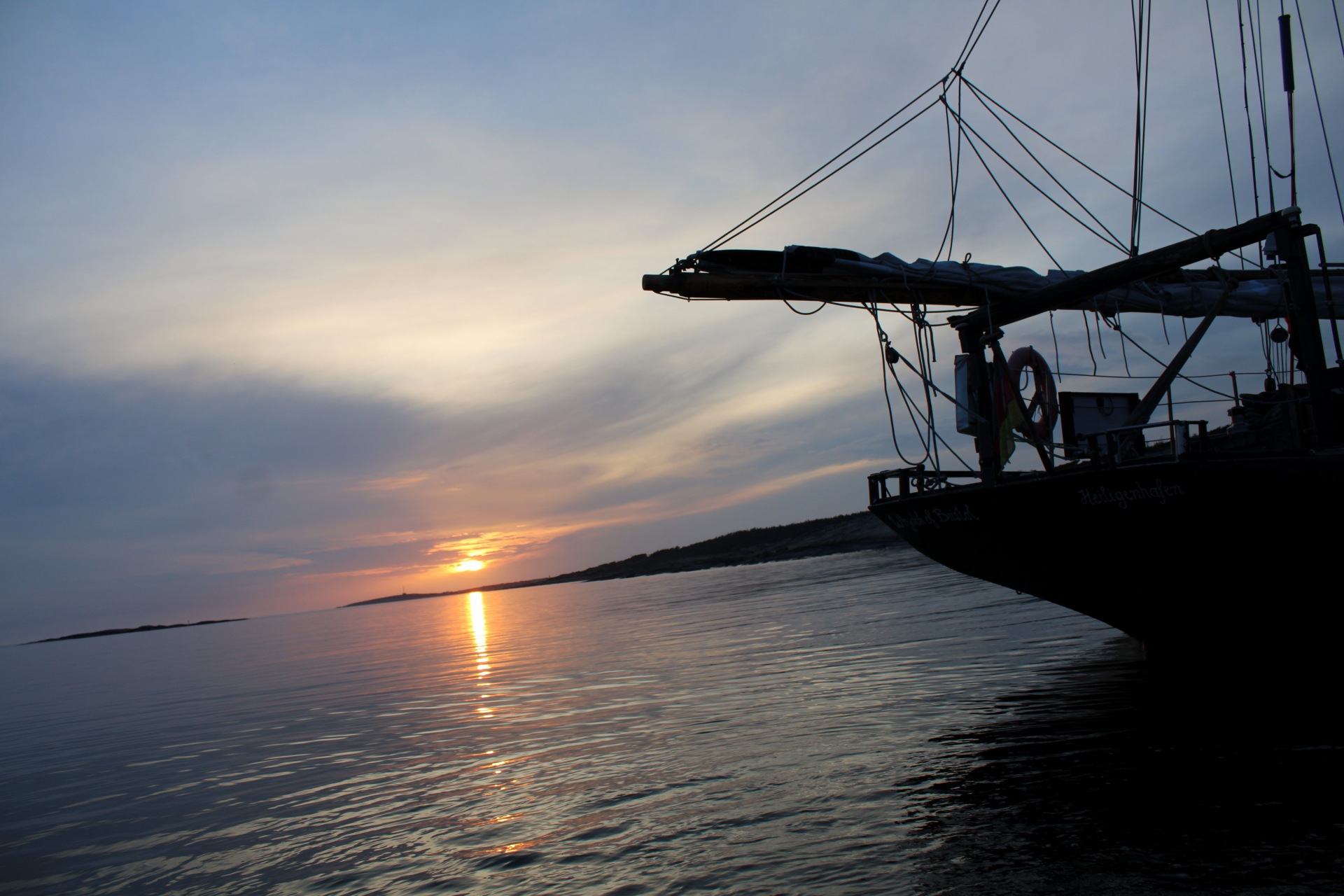 Am Abend stieß noch jemand zu uns, Greta die im benachbarten Göteborg studiert wartete auf einen Platz. Alle stimmten zu und so segelte Sie mit uns. Am Tag darauf hieß es Wachplan erstellen und Leinen los. Vor der Bucht hissten wir das erste mal die Segel übernahmen die Ruderwache und schauten im Ausguck wer so auf uns zu kam. Ein sonniger Tag mit blauem Himmel. der an einer kleinen Bucht endete. Getaucht in den Sonnenuntergang.